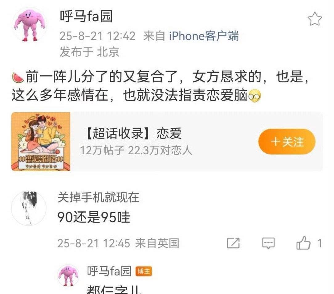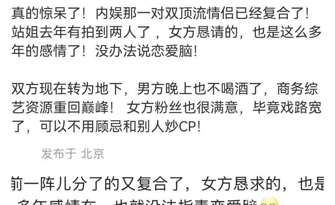 爆料引用2025年8月份的帖子“两人是前一阵儿分了的又复合了,女方恳求的,也是多年感情在,也就没法指责恋爱脑”。